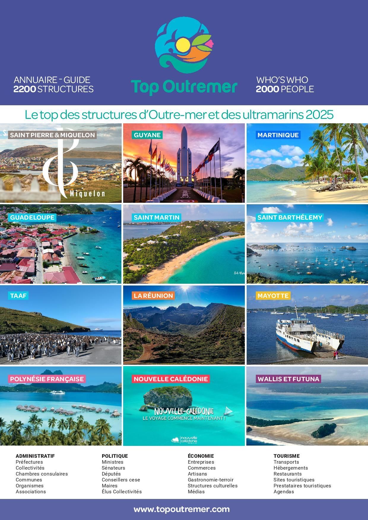 Ce site permettra de consulter le guide TOP OUTRE-MER qui sera mis en ligne en janvier 2025, avec les rubriques suivantes: